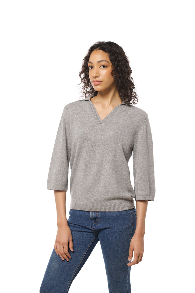 Klassisk grå kashmir genser med v-hals og krage